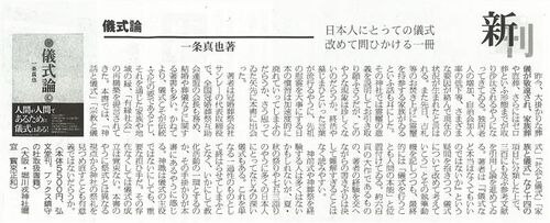一条真也です。 「神社新報」という新聞があります。神社本庁の機関紙的なメディアで、全国各地の神社で行われた祭礼や行事、これに関連する記事を中心に扱っています。主な読者は、神社本庁に属している神社や神職です。同紙の最新号(第3339号)に拙著…
