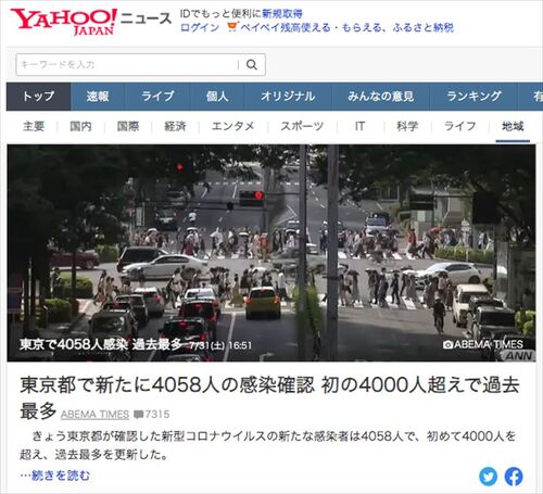 一条真也です。文月晦日となる31日、東京都が確認した新型コロナウイルスの新たな感染者は4058人。初めて4000人を超え、過去最多を更新しました。水疱瘡並みに非常に強い感染力を持つというデルタ株の脅威を感じます。 感染が確認されたのは10歳…