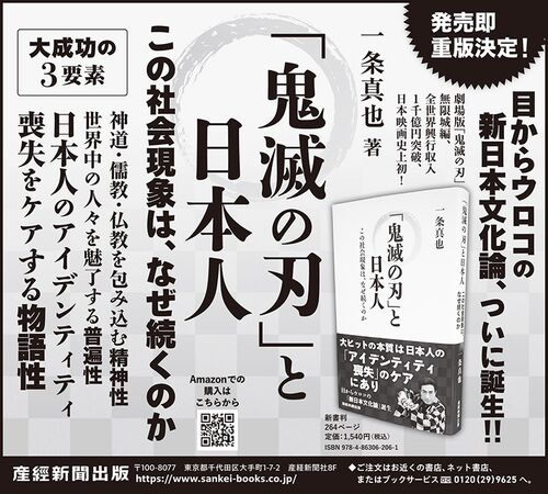 一条真也です。今日は12月10日。今朝、「毎日新聞」全国版に拙著『「鬼滅の刃」と日本人』(産経新聞出版)の書籍広告が掲載されました。 2025年12月10日付「毎日新聞」 広告には『「鬼滅の刃」と日本人』の書影とともに、「発売即重版決定!」…