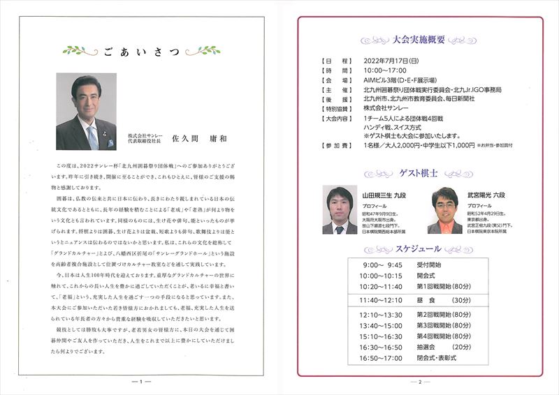 この日の「サンレー杯 北九州囲碁祭り団体戦」は、大盛況のうちに幕を閉じました。わが社は、今後とも囲碁という素晴らしい日本の伝統文化を少しでも広められるように、また、みなさまが心豊かな生活を送ることができるよう微力ながらお手伝いを続けて参りたいと考えておりますので、今後ともどうぞよろしくお願いいたします。来年お会いできることを楽しみにしています。ご参加の皆様、プロ棋士の先生方をはじめ、関係各位の皆様に心より御礼を申し上げます。