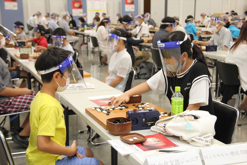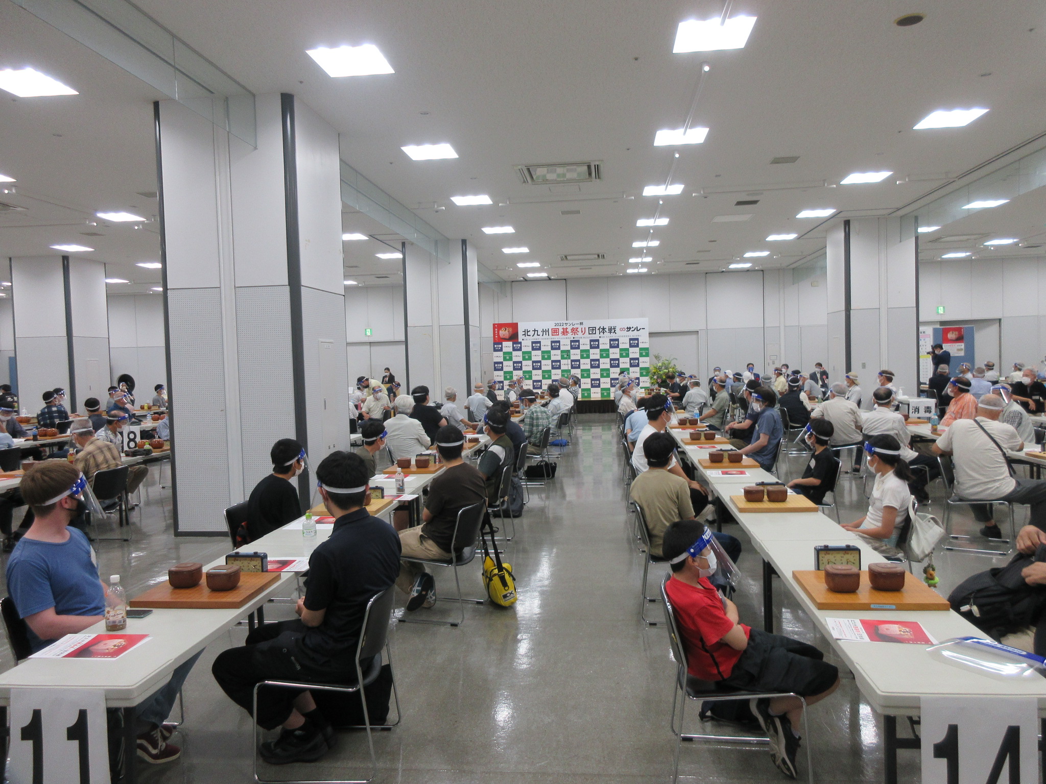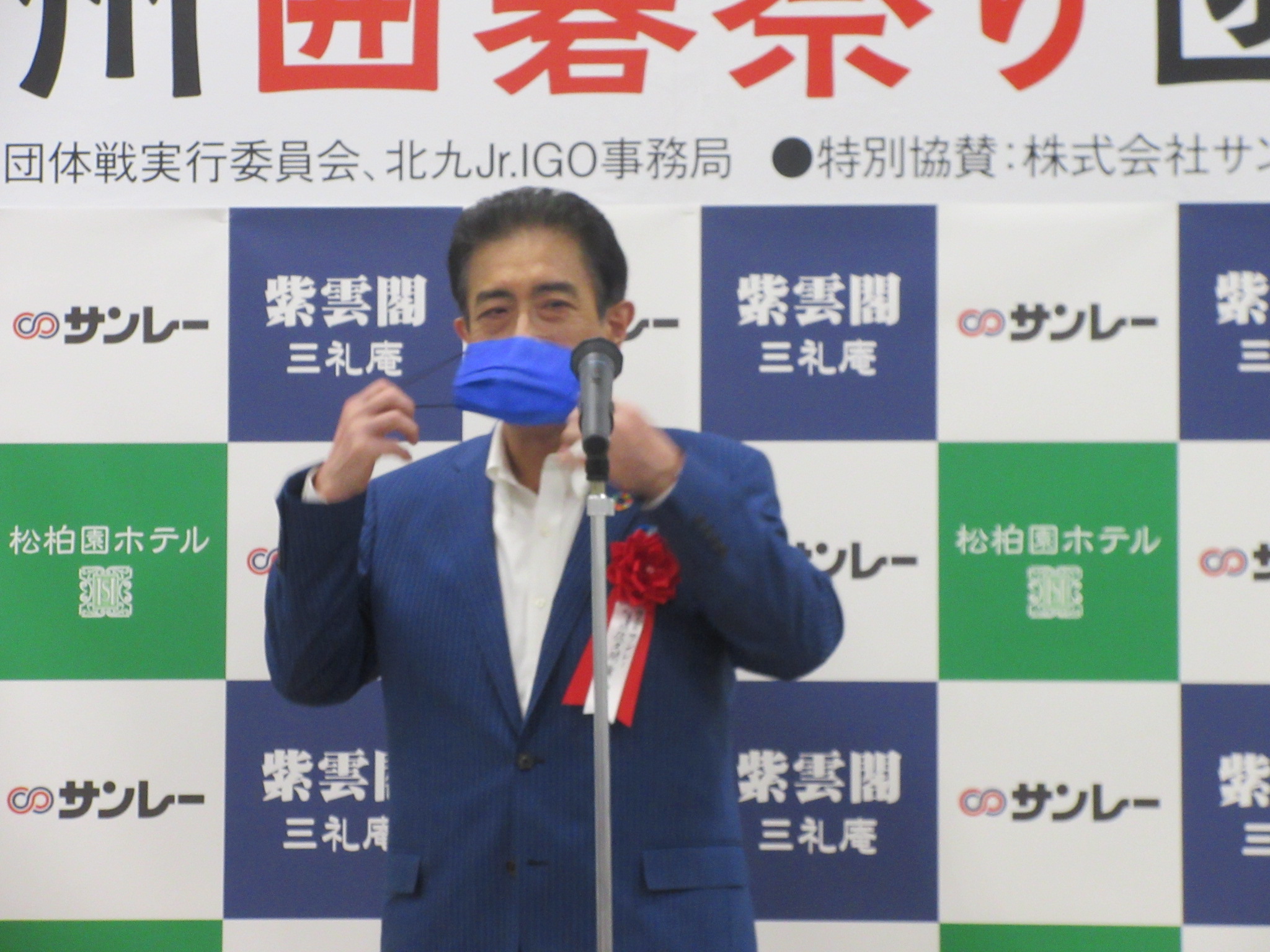 「サンレー杯 北九州囲碁祭り団体戦」の会場に入ると、やはり200名以上の棋士が集結して壮観です。「熱気ムンムン」という言葉がふさわしいです。10時からの開会式では、フェイスシールドを付けて来賓として紹介されました。その後、大会実行委員会の田畑委員長の「主催者挨拶」に続いて、わたしが「来賓挨拶」を行いました。わたしは、登壇と同時にマスクを外し、「みなさん、おはようございます! 本日は、『サンレー杯 囲碁祭り団体戦』にご参加いただきまして、誠にありがとうございます。昨年に引き続き、無事開催することができ、これもひとえに、皆様のご支援の賜物と深く感謝申し上げます。囲碁は、何もないとこから石を打っていくゲームである、宇宙創造を模しているとされています。いわば、宇宙の遊びです。スケールが大きく、心ゆたかな文化です。医学的にも右脳を刺激し判断力を高め、ストレス解消や、ボケ防止などの効果があると注目されています」と述べました。