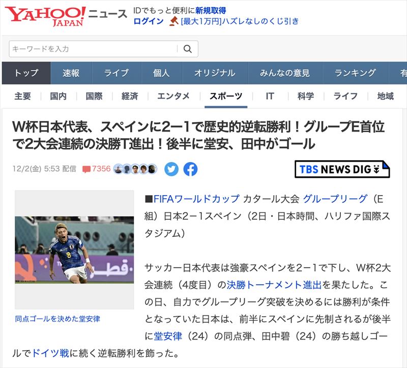 FIFAワールドカップ カタール大会 グループリーグ(E組)で、サッカー日本代表は強豪スペインを2-1で下し、W杯2大会連続(4度目)の決勝トーナメント進出を果たしました。この日、自力でグループリーグ突破を決めるには勝利が条件となっていた日本は、前半にスペインに先制されるが後半に堂安律の同点弾、田中碧の勝ち越しゴールでドイツ戦に続く逆転勝利を飾ったのでした。