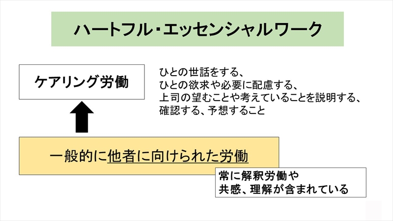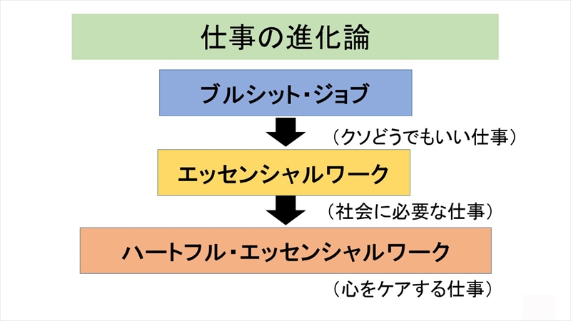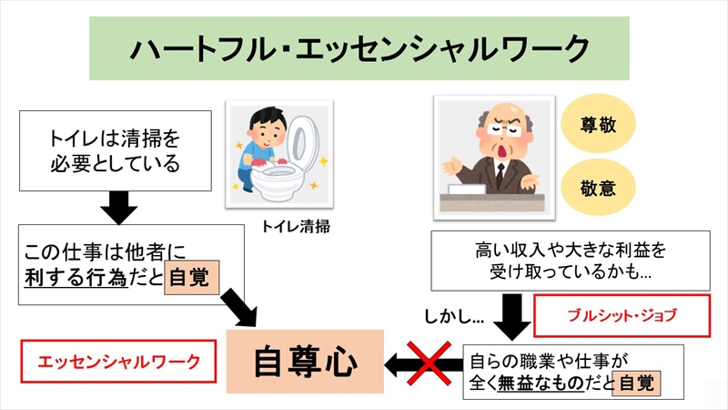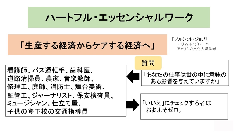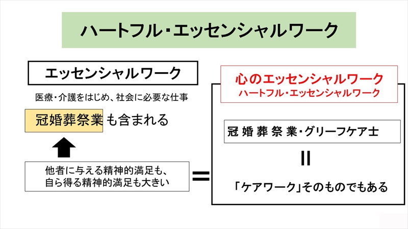 「ブルシット・ジョブ」の反対が「エッセンシャルワーク」という言葉です。これには、医療・介護などをはじめ、社会に必要な仕事のことですが、トイレの清掃も含まれます。わたしは、エッセンシャルワークに冠婚葬祭業も含まれると考えています。しかも、冠婚葬祭業は他者に与える精神的満足も、自らが得る精神的満足も大きいものであり、いわば「心のエッセンシャルワーク」、すなわち「ハートフル・エッセンシャルワーク」と呼ばれます。そして、それは「ケアワーク」そのものでもあるのです。