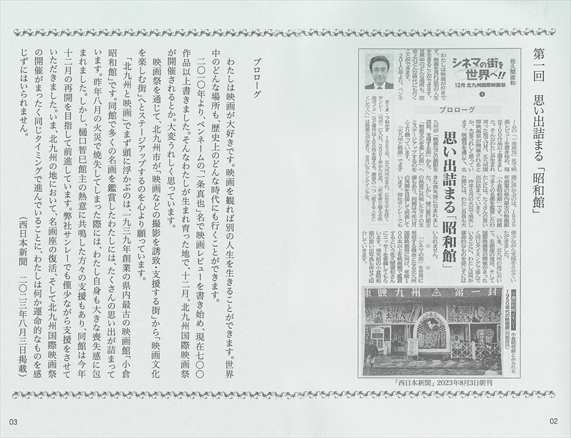 今回の新しいブックレットは、『シネマの街を世界へ!!』です。第1回「北九州国際映画祭」の開催に合わせて2023年8月3日から12月28日まで「西日本新聞」で連載した「シネマの街を世界へ!!」の全11回分の内容が収められています。「目次」は以下の通りです。