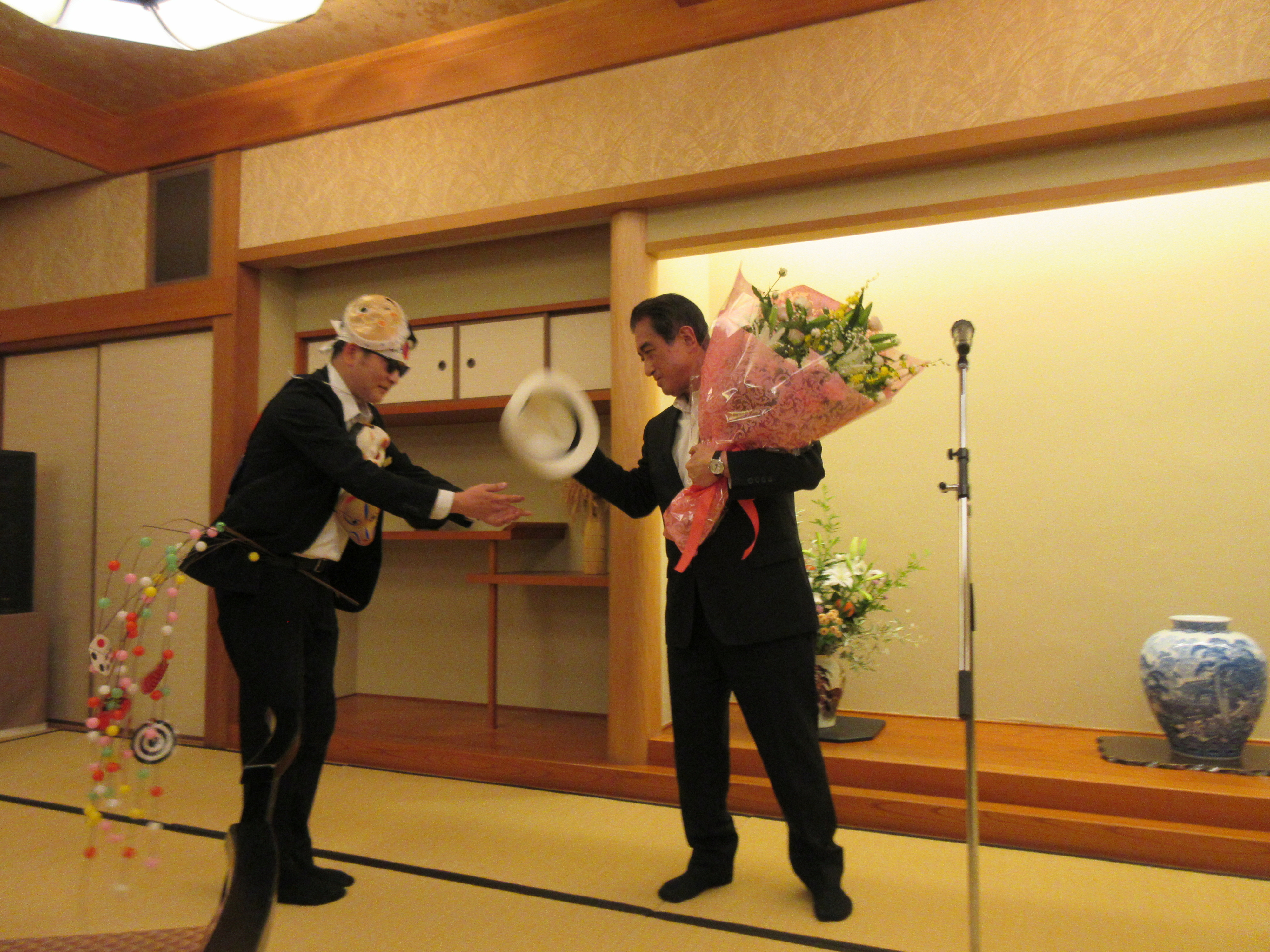 すると、「社長!」というものすごい大声が響き、会場の隅から怪しい人物が登場しました。一瞬、身構えましたが、よく見ると松柏園の中田支配人でした。彼は、「わたしは、コンパッションマン!」と名乗りました。ますます怪しい。彼は、わたしがホテルのフロントに預けた青の帽子を手に持っており、「とにかく、これをどうぞ!」と言って帽子を渡しました。わたしは、「おお、これは故アラン・ドロンも愛用したボルサリーノではないか!」と言って、頭に被りました。とんだ茶番の寸劇でした。(笑)