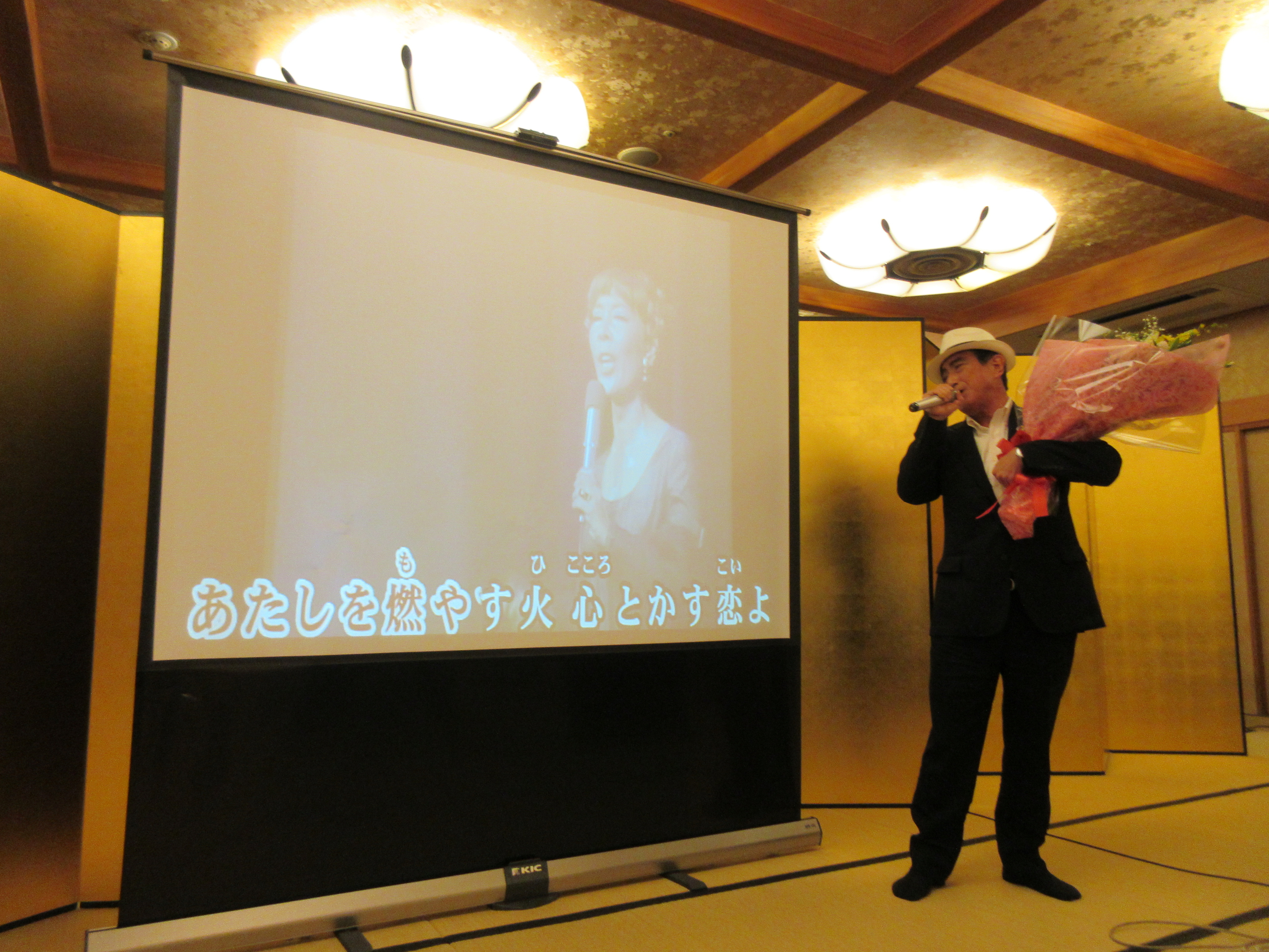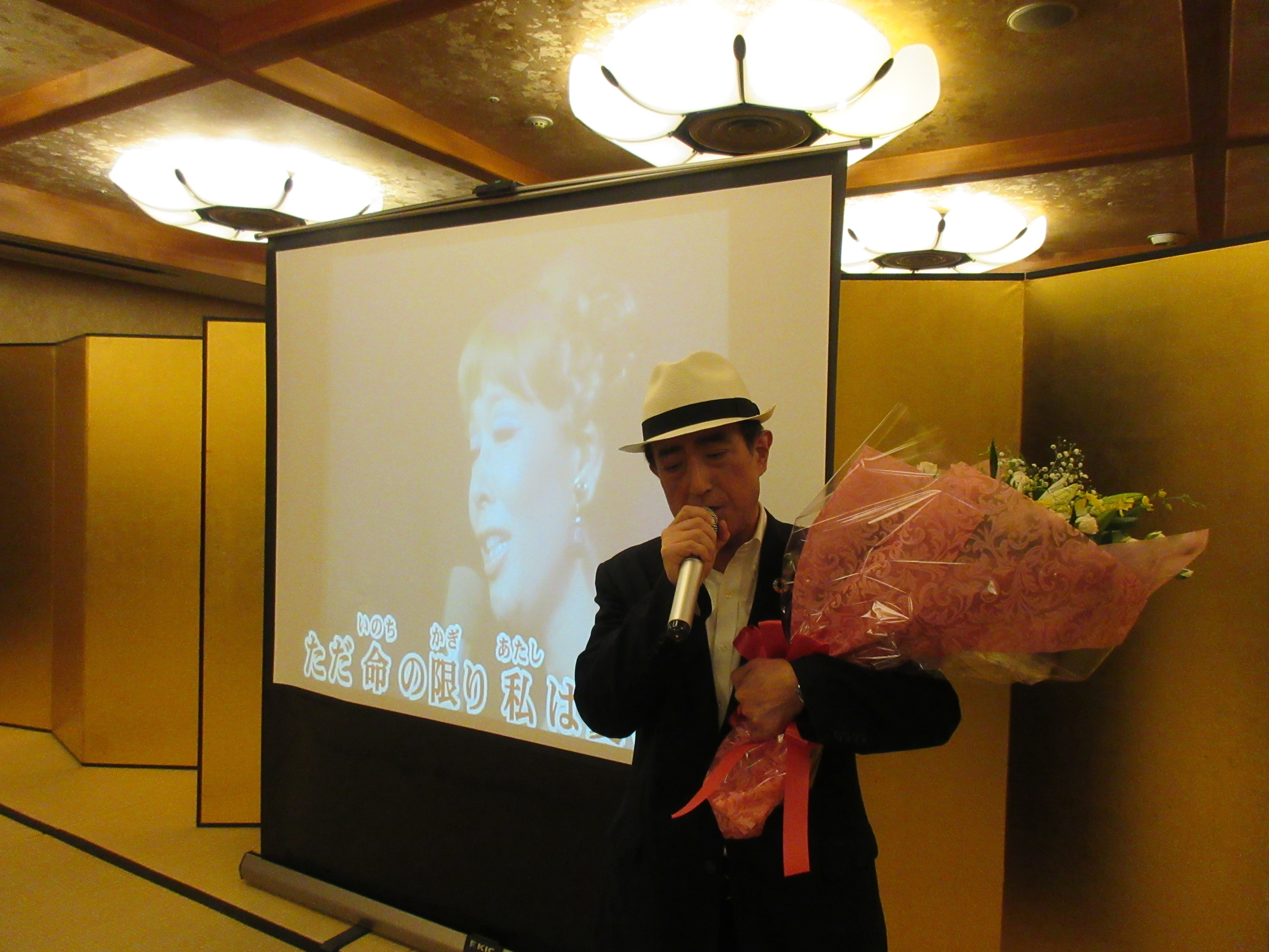 ボルサリーノを装着したわたしは、「愛の讃歌」を歌うことにしました。というのも、ブログ「花束を手に『愛の讃歌』を歌う♪」を読んだ複数の営業責任者たちから「わたしたちにも、ぜひ『愛の讃歌』を聴かせて下さいよ!」とリクエストされていたのです。用意したカラオケセットで、わたしは花束を持ったまま「愛の讃歌」を熱唱しました。歌いながら、病を闘う父とそれを心配する母のことを想いました。『佐久間進のすべて』の裏表紙には、両親の結婚式のときの写真が掲載されています。思えば、七五三も成人式も結婚式も葬儀も、そこには家族の「愛」があります。歌い終わると、「冠婚葬祭業ほど素晴らしい仕事はありません。わたしは何度生まれ変わっても、この仕事がしたい。みなさん、これからも、よろしくお願いします。ありがとう!!」と言いました。いつまでも拍手が鳴り止みませんでした。
