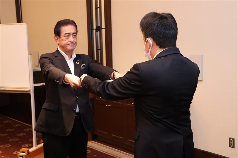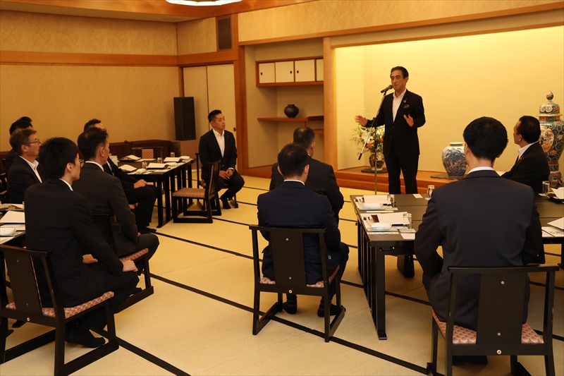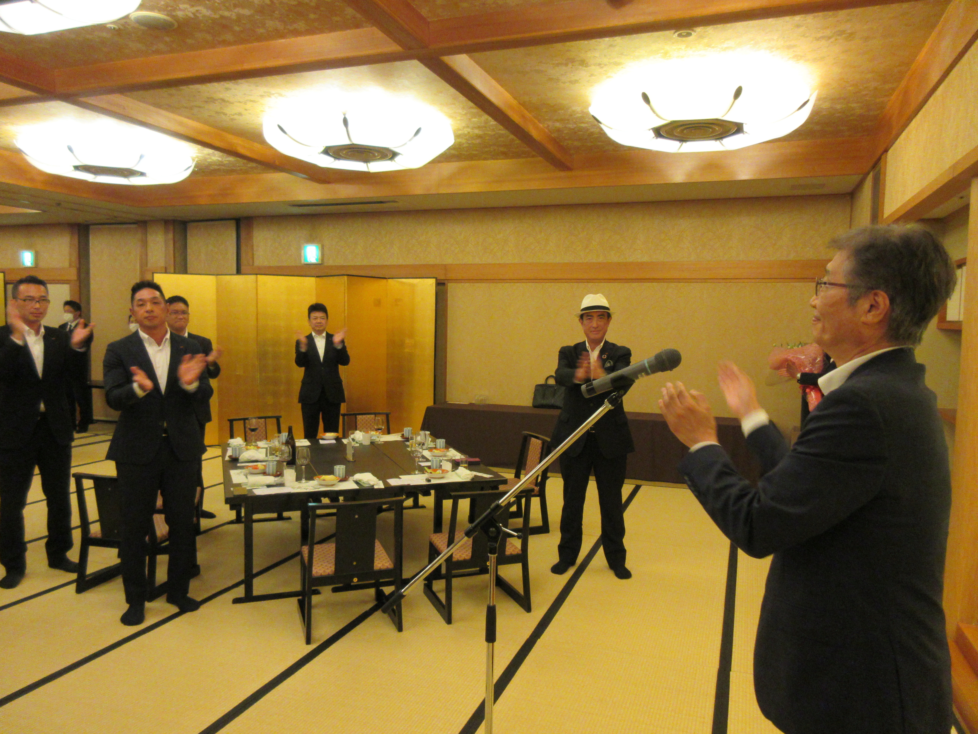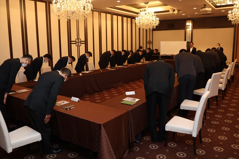 社長訓話が終わった後は、松柏園ホテルの「松柏の間」で懇親会が開かれました。最初にわたしが「これから、わたしたちはわたしたちは食事をします。『食事』という文字は『人に良い事』と書きます。一緒に食事をしたり、盃を交わすのは腹を割った人間関係をつくる最高の方法です。営業のみなさんはよく頑張っていますが、さらに高い目標を持って前進していただきたい。これらのコンパッション時代を先取りして、業界のフロントランナーになりましょう!」と述べました。それから、岸執行役員の音頭で乾杯しました。