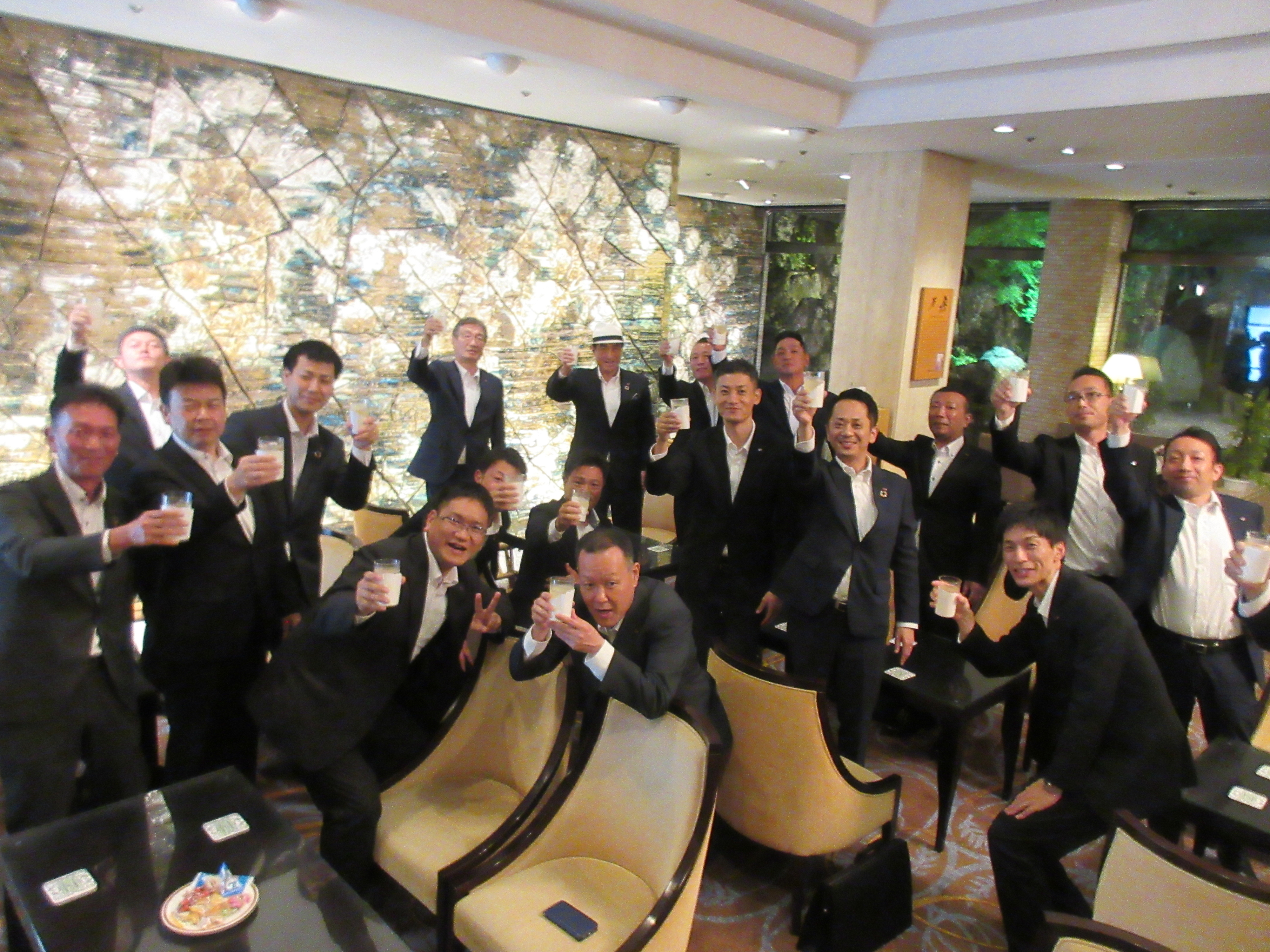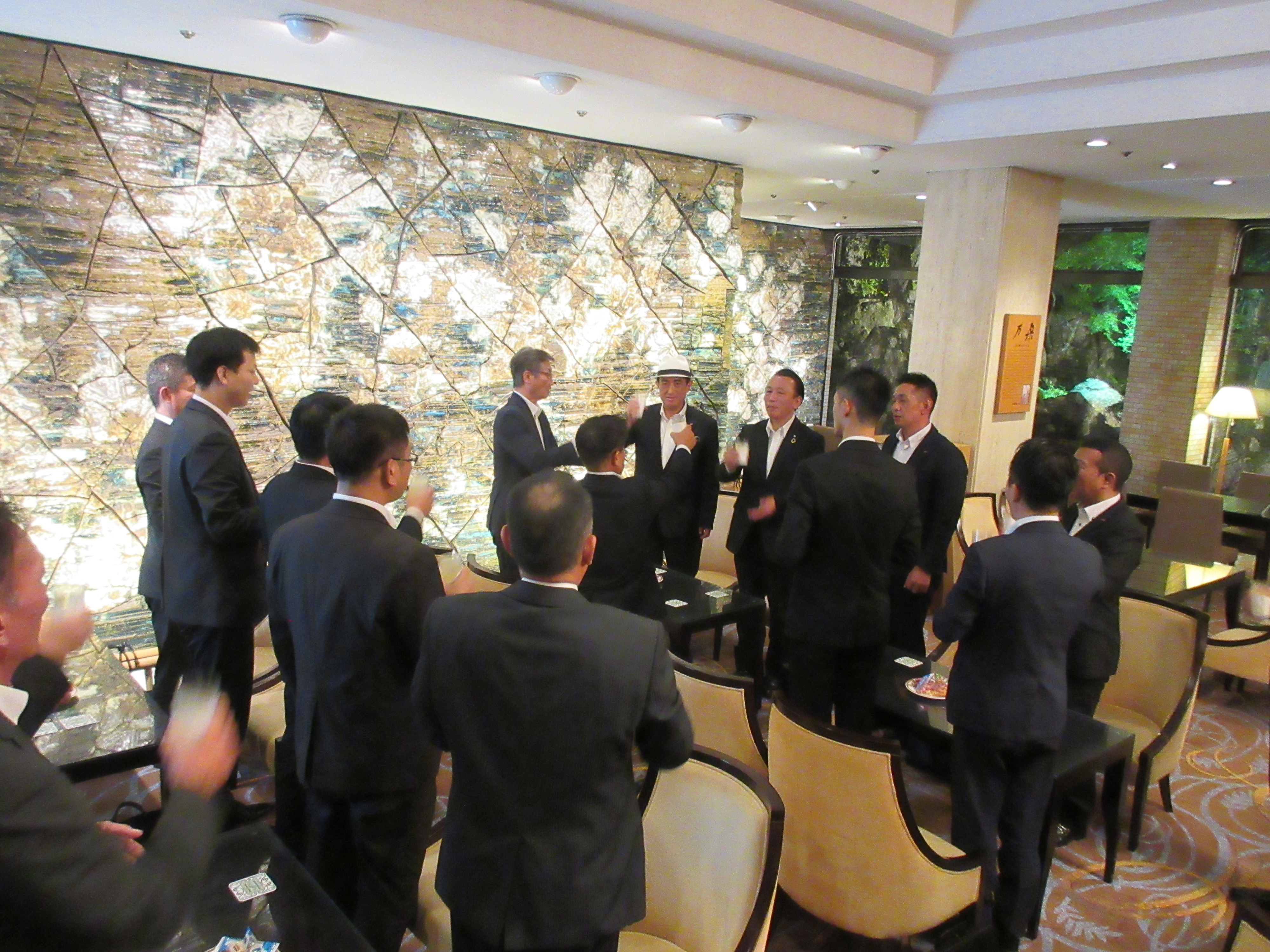 その後、二次会も開かれました。二次会では、沖縄の瀬名波執行役員が素晴らしい乾杯の音頭をしてくれました。会場は、 ブログ「人間国宝を囲む会in松柏園」で紹介した加藤唐九郎作の大陶壁「万朶」の前のラウンジです。この日は、みんなの「こころ」が1つになりました。これからも、一緒に頑張ろう!