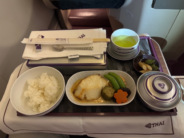 飛行機は空いていましたが、わたしはほとんど寝付けず、暗くて本も読めないので、iPhoneで音楽を聴いていました。明け方になって朝食が提供されました。搭乗時にオーダーしておいた日本食でしたが、お腹が空いていないので、半分だけいただきました。食後は、音楽を聴きながら雲海などを見て、いろいろ考え事をしました。福岡空港には予定されていた8時ちょうどに到着しました。福岡の気温は31度で、バンコクより暑いです!