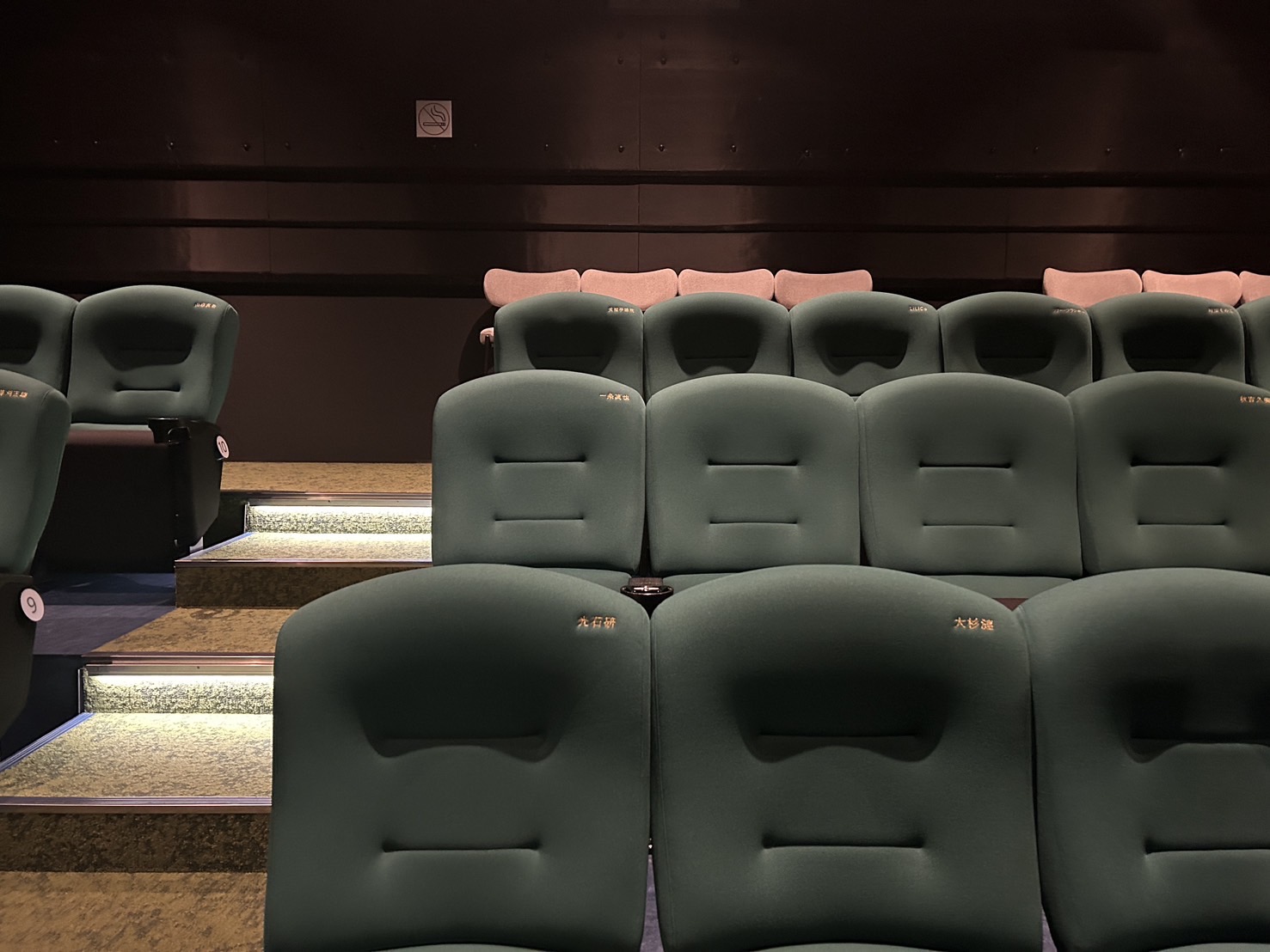 わたしのシートは9列の4番でした。わたしは映画鑑賞する際、いつも最後列の通路側の席に座ります。ここ小倉昭和館の場合は、最後列である10列4番に座ることが多いのですが、この席はすでに「笑福亭鶴瓶」さんの名前が入っていました。それで1つ前の9列4番を選んだ次第です。ブログ「35年目のラブレター」で紹介した感動作に主演された鶴瓶師匠の前の席なんて、光栄ですね!