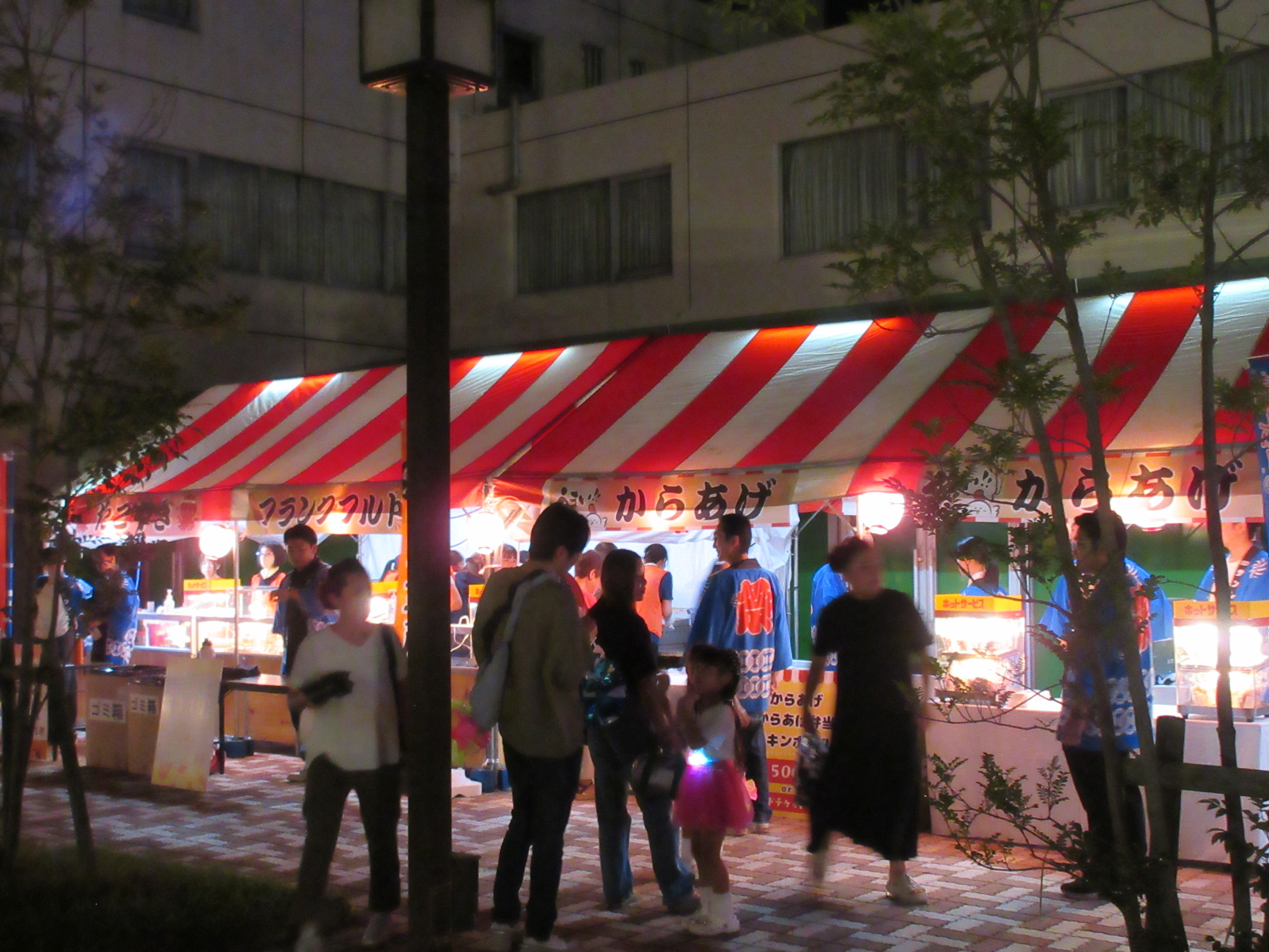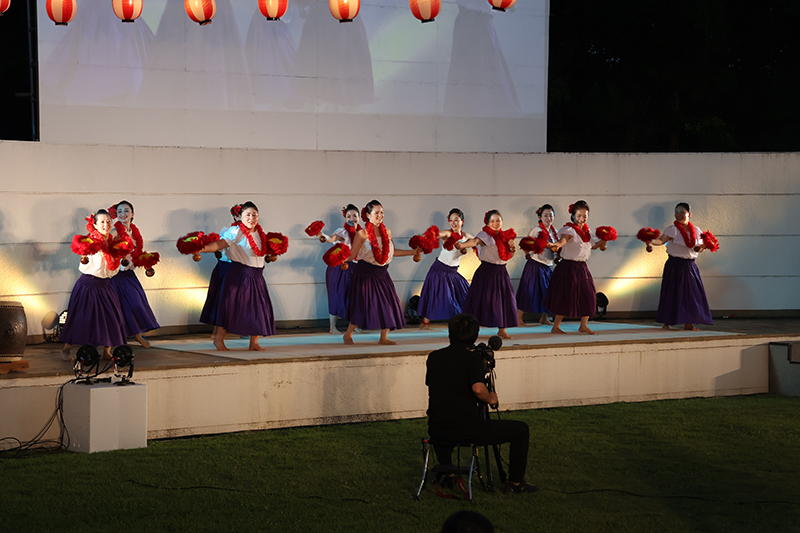 さらに、ステージイベントとして、キッズダンス~BOOZER CRiB、日本舞踊、フラダンスも行われ、お祭りに華を添えていました。総合芸術であると同時に宗教的な行為でもあるハワイの伝統的な歌舞音曲「フラ」。フラにはダンス、演奏、詠唱、歌唱の全てが含まれます。美しく幻想的な「フラ」の魅力を堪能しました。月あかりの下で繰り広げられるフラダンスは、まるで天女の舞のようでした。ちなみに、フラダンスは死者を供養するためのハワイの踊りです。日本でいえば「盆踊り」と同じなのです。