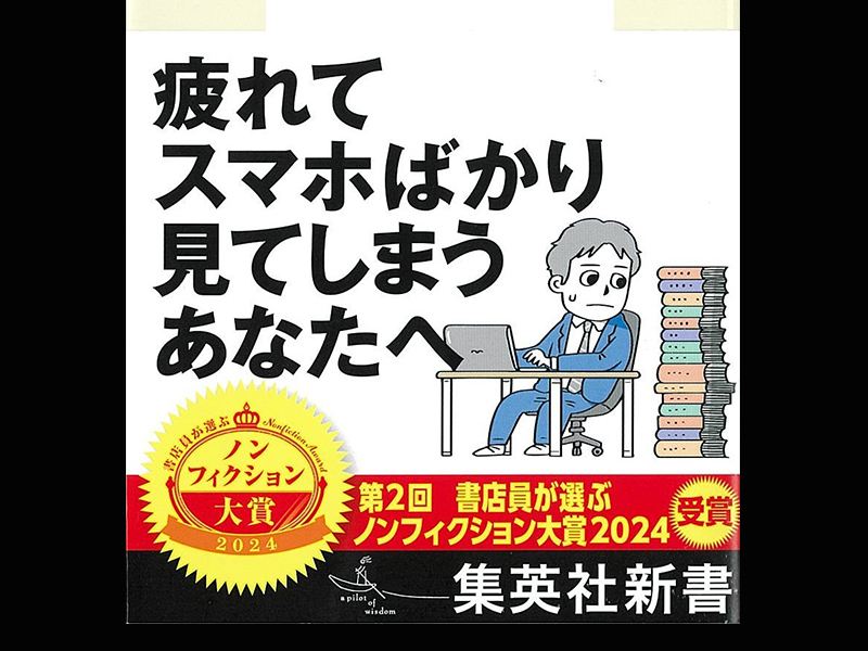 本書の帯には、積み上げられた大量の本に恐れおののいている会社員風の男性のイラストとともに、「疲れてスマホばかり見てしまうあなたへ」「第2回 書店員が選ぶノンフィクション大賞2024受賞」と書かれています。