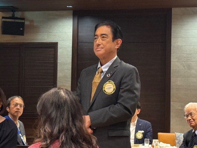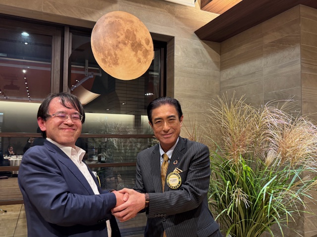 わたしたち夫婦は、小倉高校の同級生である野嶋副会長夫妻と同じテーブルになりました。観月会の司会は湖月堂社長の本村会員が担当しました。冒頭、二村ソングリーダーの指揮によってロータリー・ソングが歌われました♪ その後、高山会長(八坂神社宮司)から挨拶がありました。