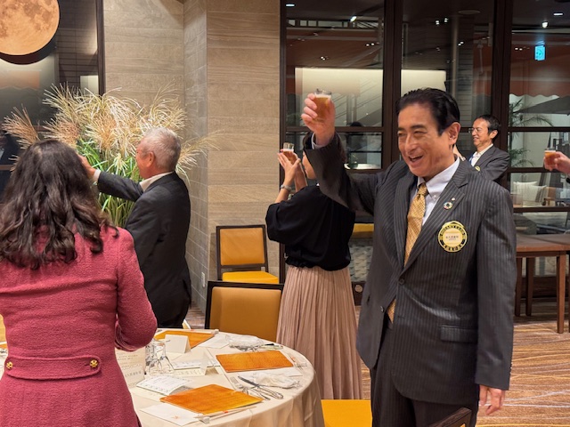 その後、ニコニコ献金の時間となり、わたしの名前が呼ばれました。わたしの「本日は、松柏園ホテルをご利用いただき、ありがとうございます。昨年の観月会は、父が亡くなった当日で参加が叶いませんでした。おかげさまで一周忌も無事に終わりました。みなさまのご厚情に感謝いたします」というメッセージが読み上げられた後、一礼しました。その後は、お待ちかねの乾杯の時間です。日本一のスピーチの達人である永照寺の村上住職が、ご自身の頭を撫でながら「こんばんは。わたしは小倉ロータリーの満月男です!」と言って笑いを誘ってから、乾杯となりました。