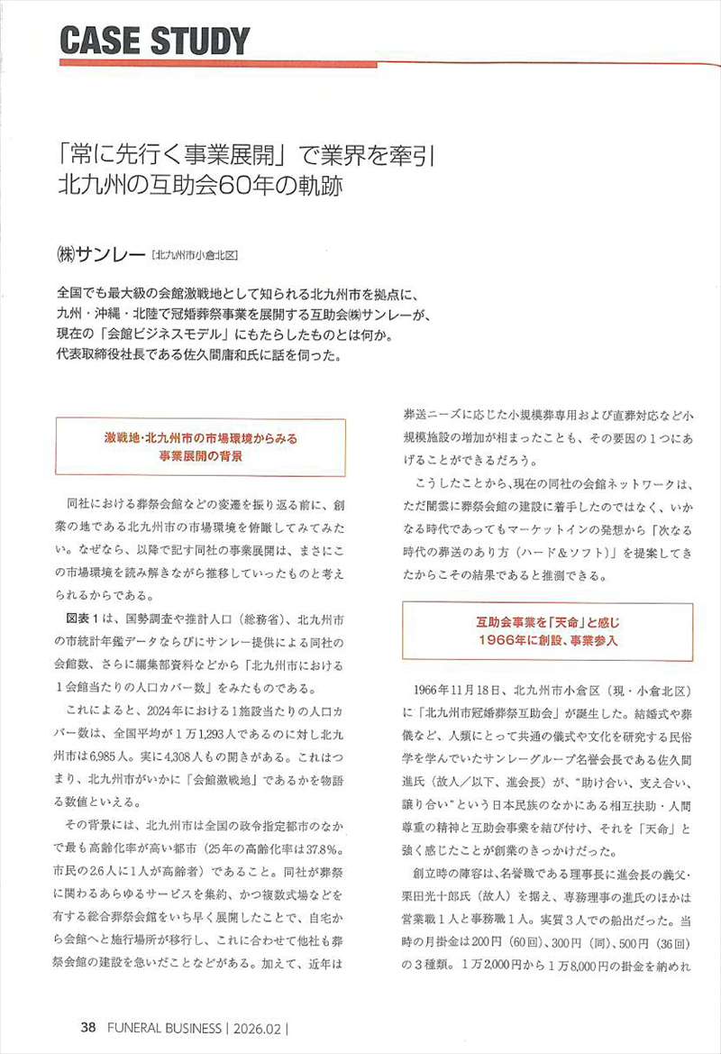 一条真也です。冠婚葬祭業界のオピニオン・マガジン「月刊フューネラルビジネス」2月号の特集は「葬祭ビジネスの変遷と今後」ですが、「『常に先行く事業展開』で業界を牽引 北九州の互助会60年の軌跡」として、わが社サンレーの歩みが8ページにわたって紹介されました。