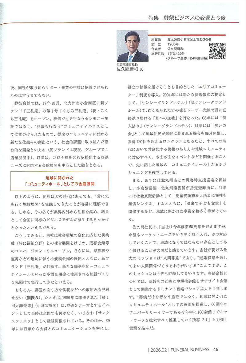 そして、「地域に開かれた『コミュニティホール』としての会館展開」の小見出しで、「以上のように、同社はどの時代にあっても、“常に先行く施設展開”を実践してきたことが容易に理解できる。しかも、その多くが業界内外から注目を集め、結果として全国に同様のビジネスモデルが派生するきっかけとなったといえるだろう。 こうしてみると、同社は社会環境の変化に応じた異業種(特に福祉分野)との複合展開をはじめ、既存会館等のコンバージョン・リニューアル。さらには、家族葬や直葬などの増加に伴う小規模会館の展開とともに、新ブランド『三礼庵』が目指す、新たな葬送空間=コミュニティホールといった多様な用途に使用される施設づくりを先駆けて実行してきたといえる。もちろん、葬送のあり方や供養などへの取組みも見逃せない。たとえば、1986年に開催された『第1回大葬祭博』(小倉紫雲閣)は、葬儀をテーマとするイベントとして当時は全国でも例がなく、いまなお『サンクスフェスタ』として継続開催されている。そのほか、89年には日頃から会員とのコミュニケーションを密にし、役立つ情報を届けることを目的とした『エリアコミューター』制度を導入」と書かれています。